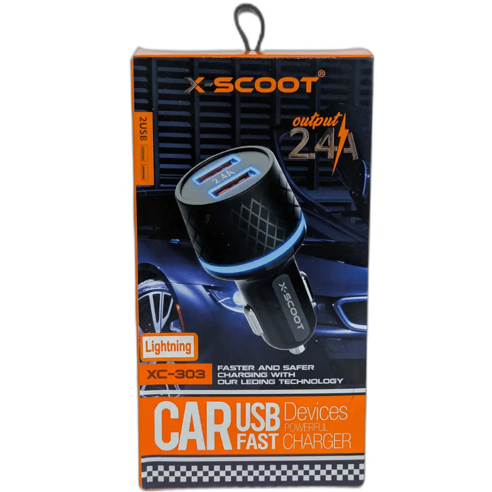 Cargador de Carro XSCOOT Lightning 2.4A Modelo XC-303, carga rápida, protección de seguridad, diseño elegante y uso versátil para dispositivos móviles.