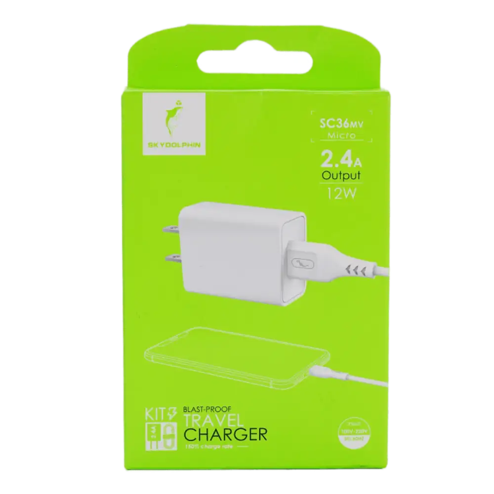 Cargador Micro USB Completo Skydolphin 2.4A 12W para Carga Rápida y Eficiente Compatible con Dispositivos Móviles y Accesorios Electrónicos