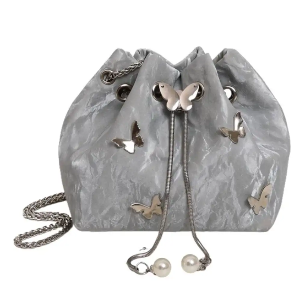 • El diseño incorpora un delicado lazo de moda en la parte superior que aporta un toque femenino y sofisticado, complementado por una cadena metálica de acabado pulido que permite llevar el bolso como cruzado o colgante los sutiles adornos de mariposa, cuidadosamente aplicados, añaden un detalle artístico que destaca entre la multitud y realza cualquier atuendo, ya sea casual o de gala. Cada elemento ha sido seleccionado para equilibrar estilo y funcionalidad, creando una pieza versátil que se adapta a distintas ocasiones sin perder su carácter distintivo.