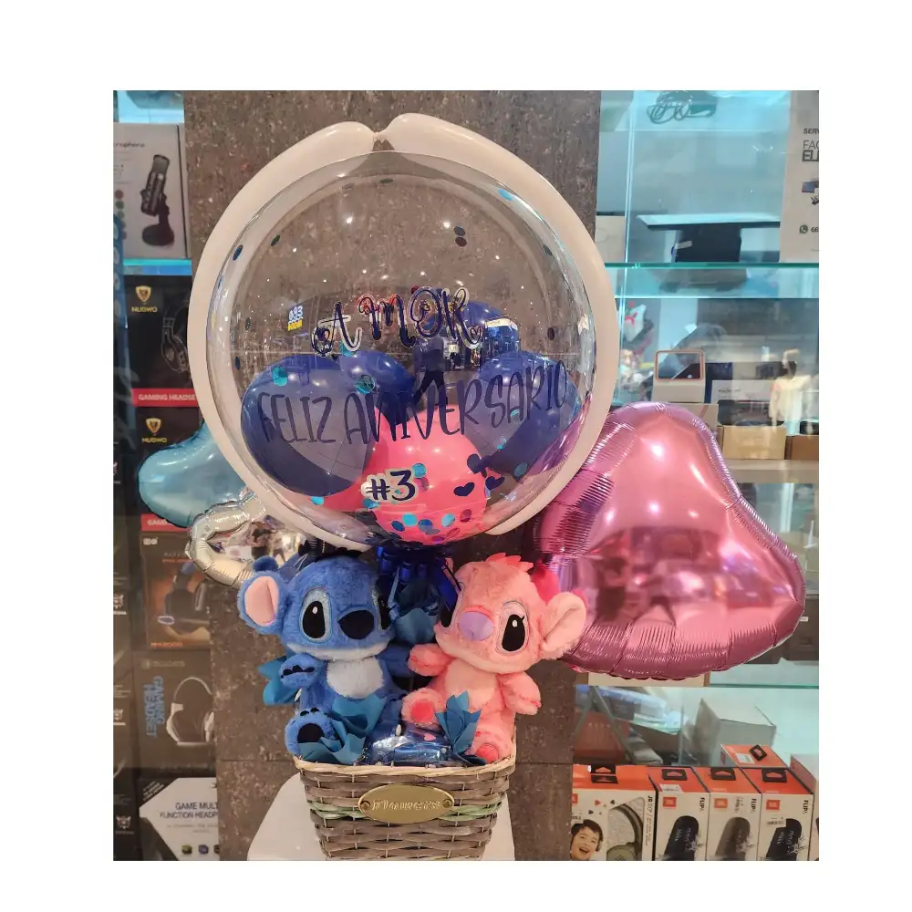 Arreglo temático de peluches de Stitch para celebrar fechas especiales: combinación única de ternura, originalidad y detalle artesanal que convierte cualquier ocasión en un recuerdo inolvidable para niños y adultos.