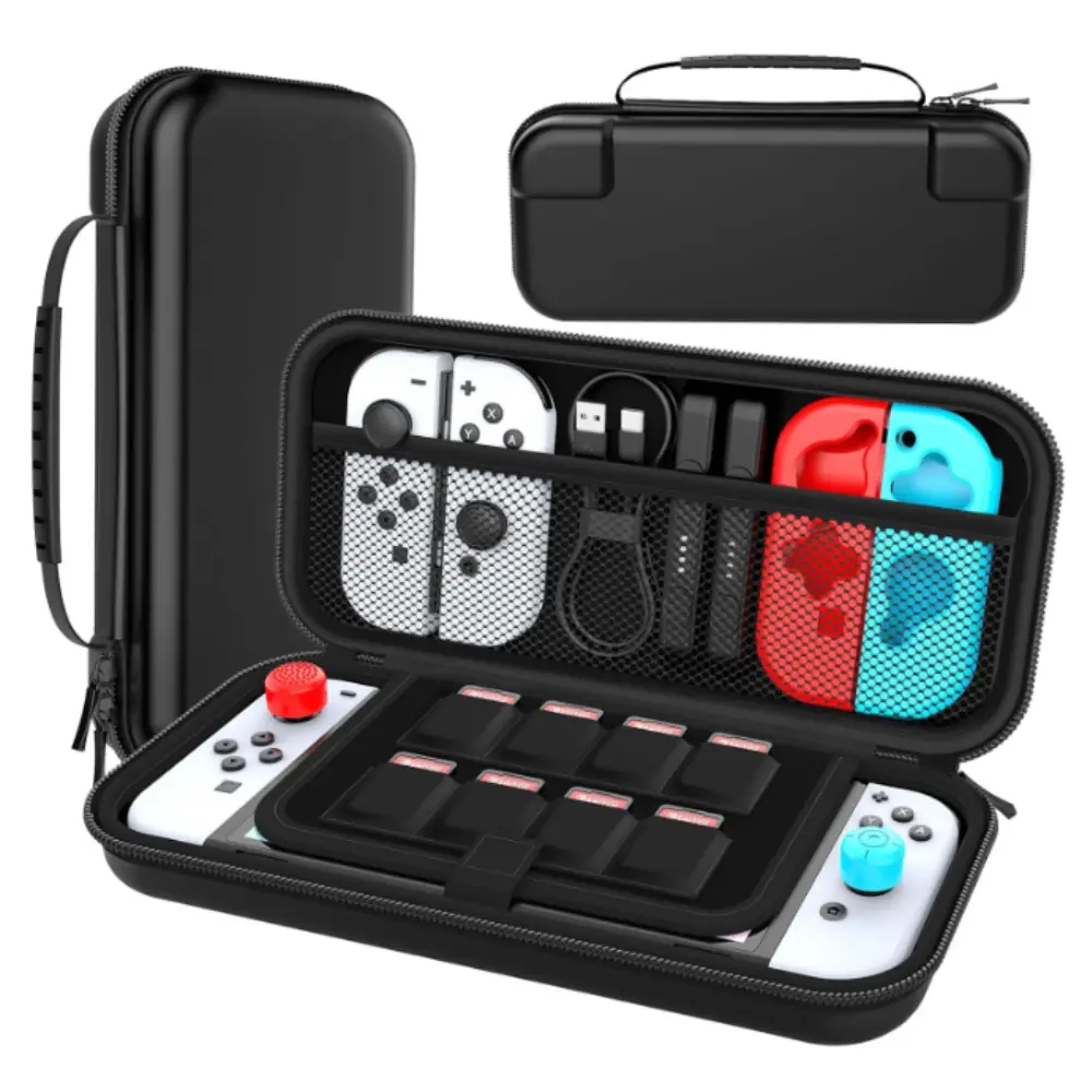 • Un estuche diseñado con materiales duros y resistentes, ideal para proteger la consola Nintendo Switch de golpes, caídas y arañazos. Su interior acolchado evita daños en la pantalla y cuenta con compartimentos para almacenar juegos y cables.
