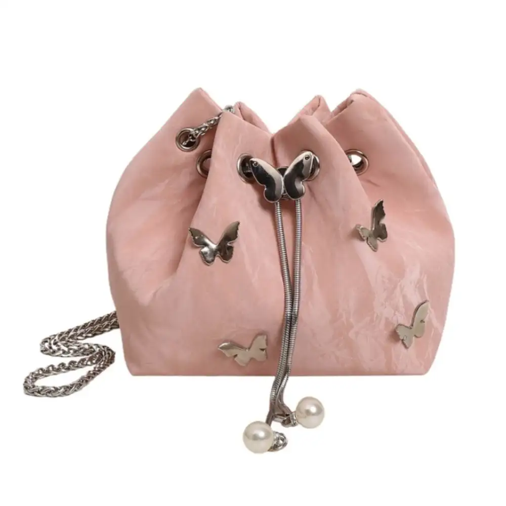Bolso de mano femenino rosa con lazo y adornos de mariposa, cadena cruzada ajustable, alta calidad y amplio interior elegante y versátil para cualquier ocasión.
