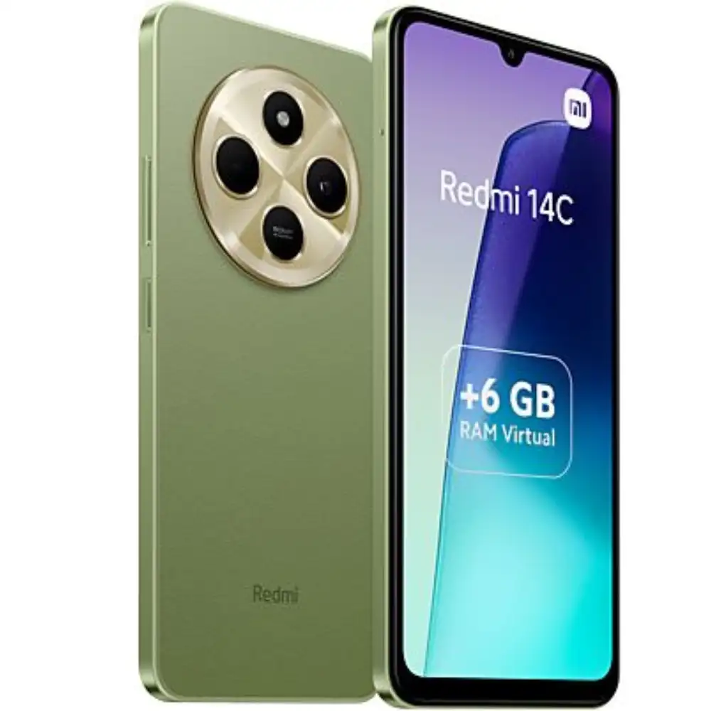 Redmi 14C de 6.5\" con pantalla Full HD+, 4RAM, 128 GB, cámara dual 50 MP, batería 5000 mAh y acabado verde ofrece rendimiento y estilo a precio accesible.