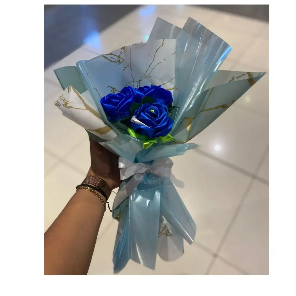 Descubre el elegante arreglo manual de rosas azules de tela, el regalo perfecto para aniversarios y cumpleaños que brinda estilo duradero y sin mantenimiento.