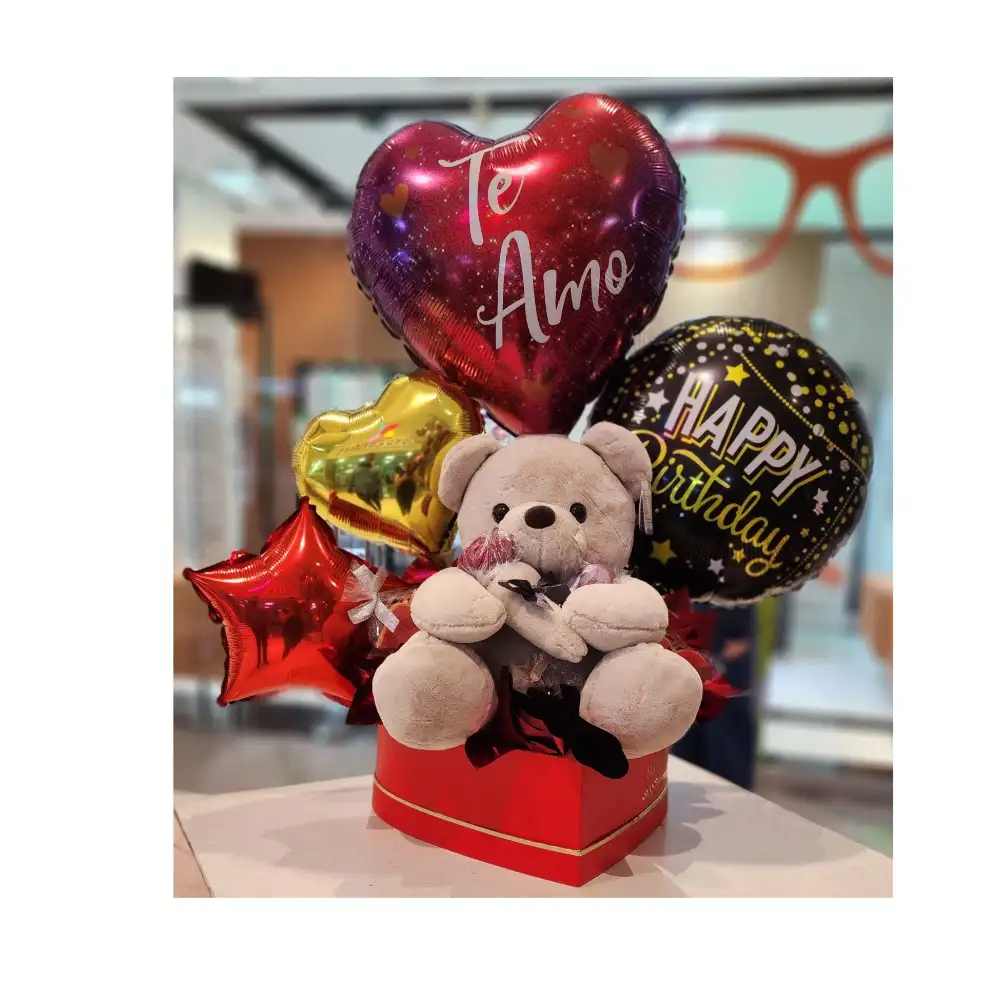 Arreglo de globos con peluche de osito de alta calidad, diseño exclusivo para regalos en cumpleaños, aniversarios, bodas y fechas especiales, combinación vibrante y toque tierno que sorprende y emociona a todos los destinatarios