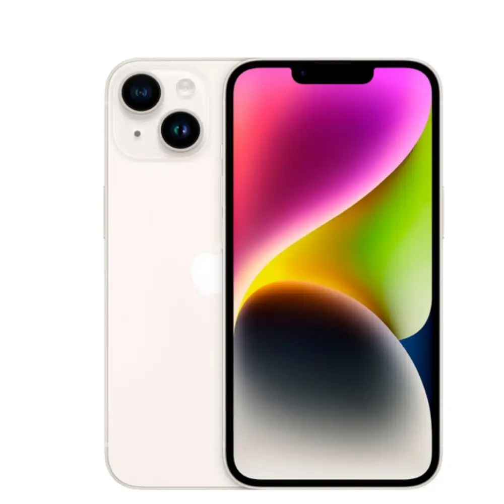 iPhone 14 renovado 128 GB Starlight, pantalla Super Retina XDR, cámara dual 12 MP, chip A15, iOS 17, 5G y batería optimizada calidad certificada y rendimiento como nuevo.