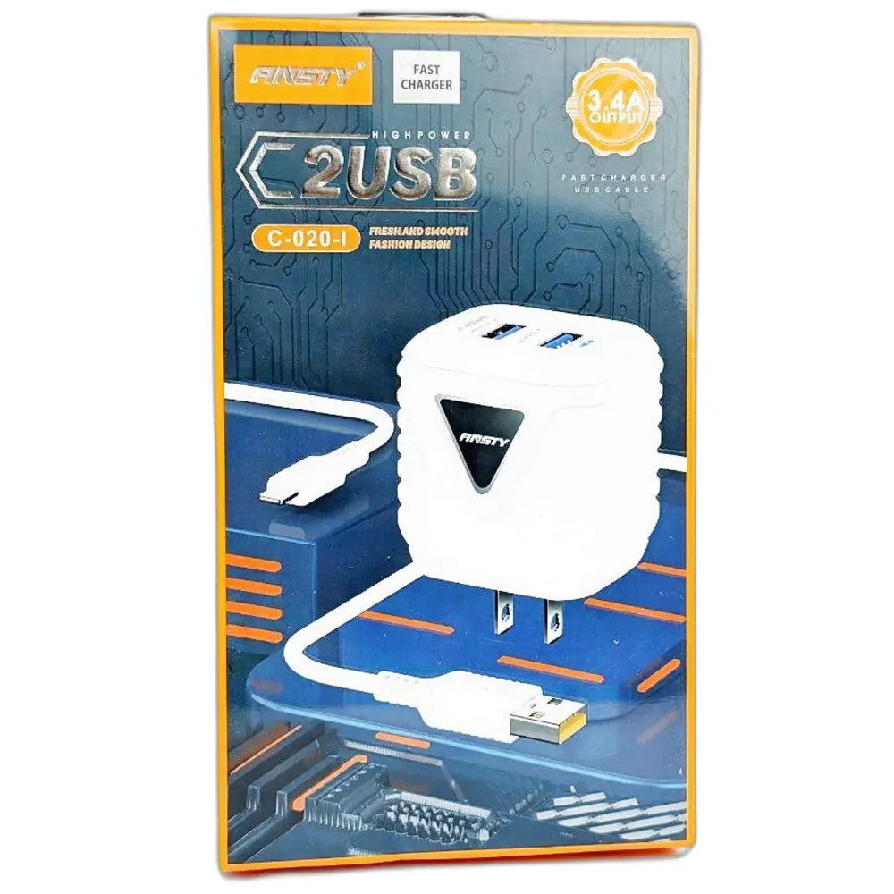 Cargador Ansty 2USB 3.4 Modelo C-020-I, ideal para carga rápida de smartphones y tablets, compacto y seguro, perfect para viajes y uso cotidiano.