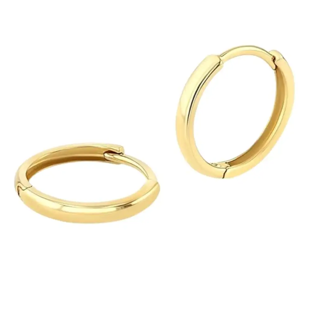 Descubre el par de aros de acero inoxidable con acabado dorado de 1,4 cm, hipoalergénicos y resistentes, perfectos para cualquier ocasión y presentados en caja.