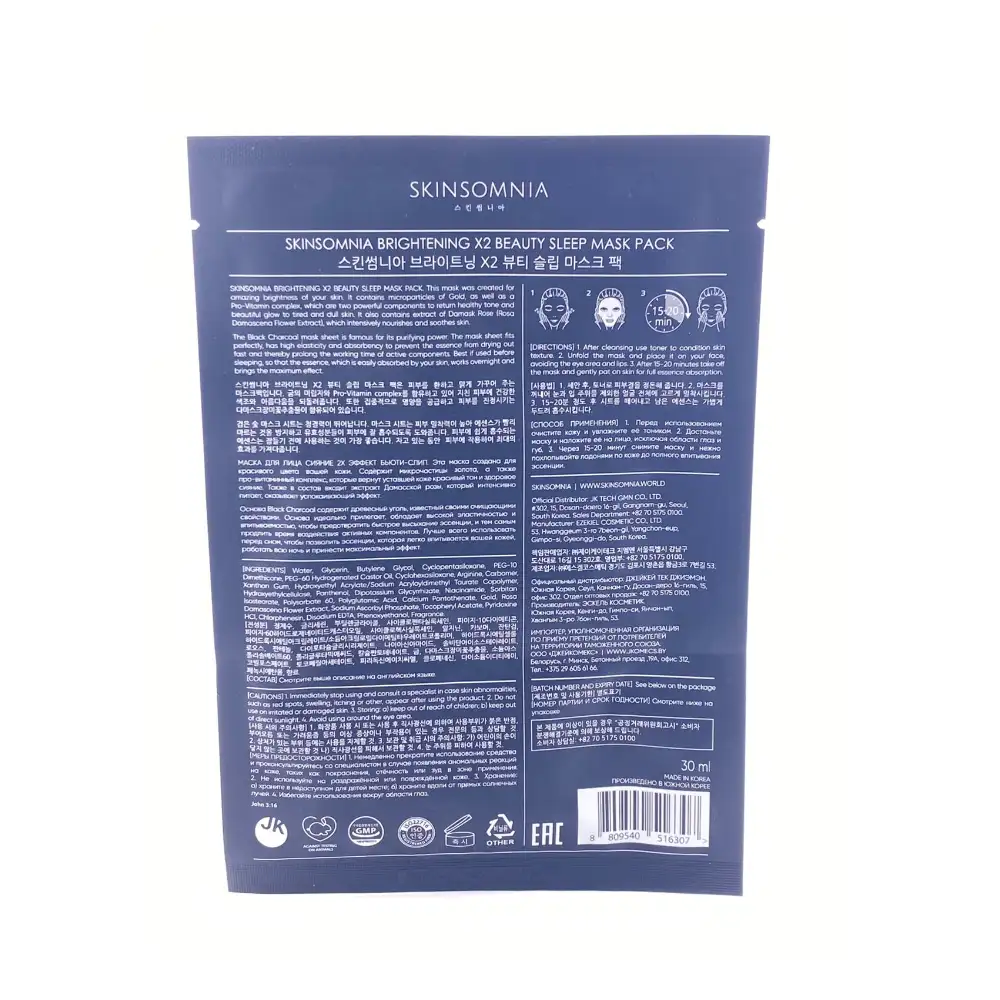 Mascarilla para Dormir Skinsomnia Brightening X2 Beauty con oro puro 99.9%, rosa de Damasco y carbón negro ilumina, purifica y revitaliza la piel mientras duermes.