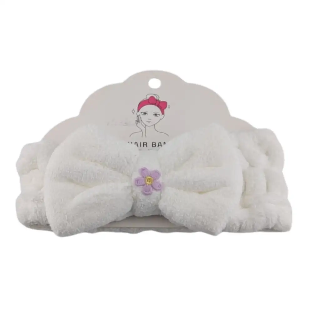 Diadema de felpa blanca con lazo decorativo, suave e hipoalergénica, ideal para spa, cuidado facial y maquillaje mantiene el cabello alejado sin irritar.