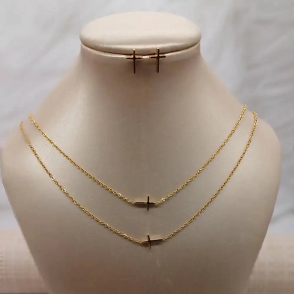 Descubre el set de collar y aretes dorado, una combinación de elegancia y calidad que realza tu estilo en cualquier ocasión, con acabado brillante y diseño versátil.