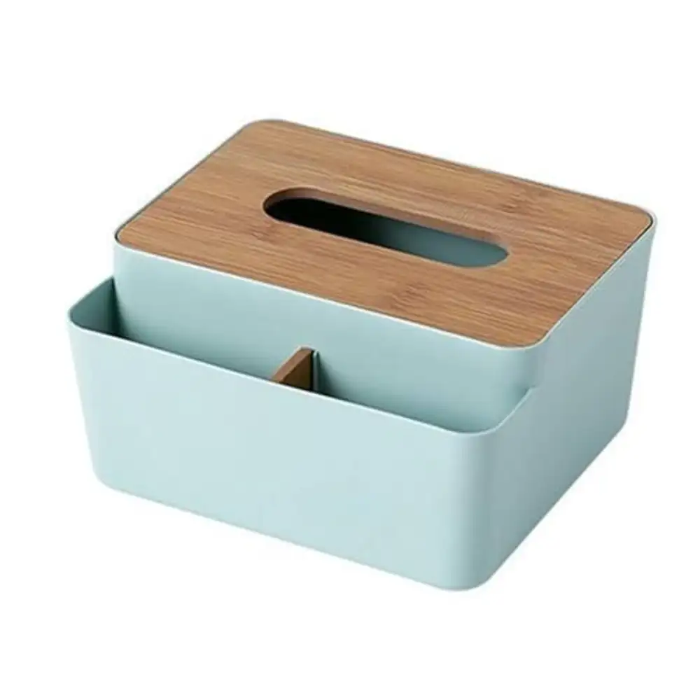 Caja organizadora de almacenamiento con tapa de madera elegante, ideal para papel de seda, maquillaje, accesorios de escritorio y teléfono, con múltiples compartimentos y diseño robusto
