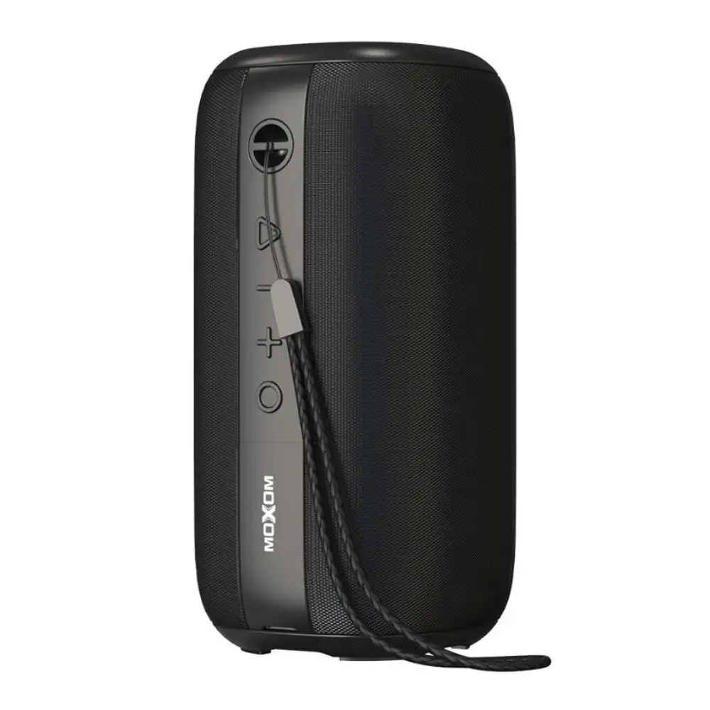 Parlante Moxom HIFI Wireless negro con sonido envolvente, Bluetooth 5.0, diseño premium y batería de 12 h, ideal para hogares y oficinas en Panamá y diversión.