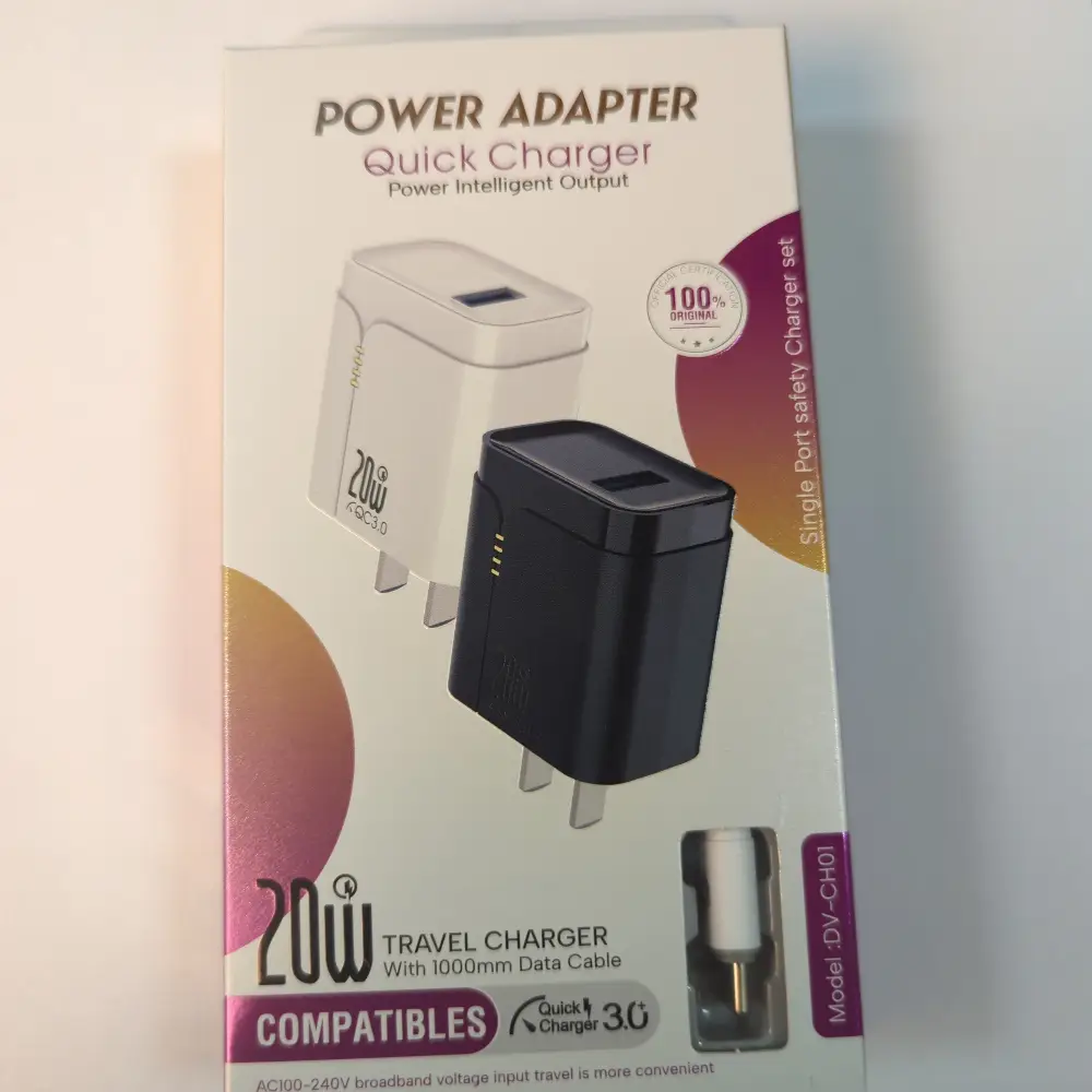 Cargador Power Adapter 20W Tipo C 3.0, carga rápida y eficiente para tus dispositivos. Diseño compacto y seguro. Compatible con múltiples marcas.