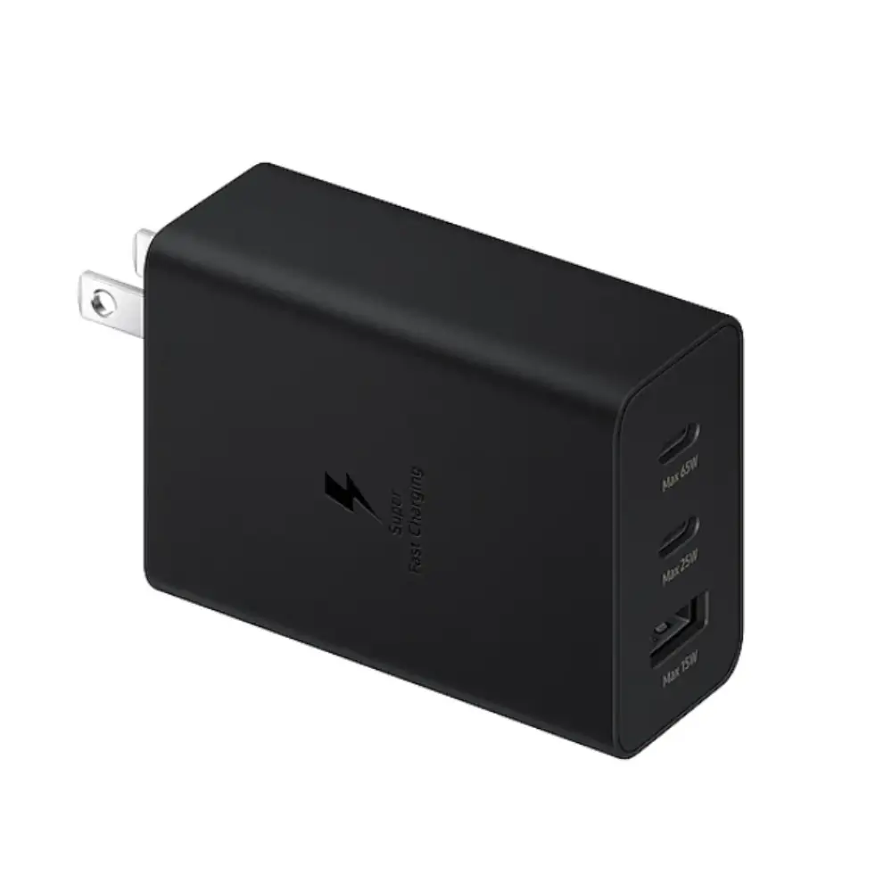 SAMSUNG Cargador de pared de carga súper rápida de 3 puertos, 1 USB-C 65 W, 1 USB-C 25 W, 1 USB-A 15 W, capacidad máxima de 65 W