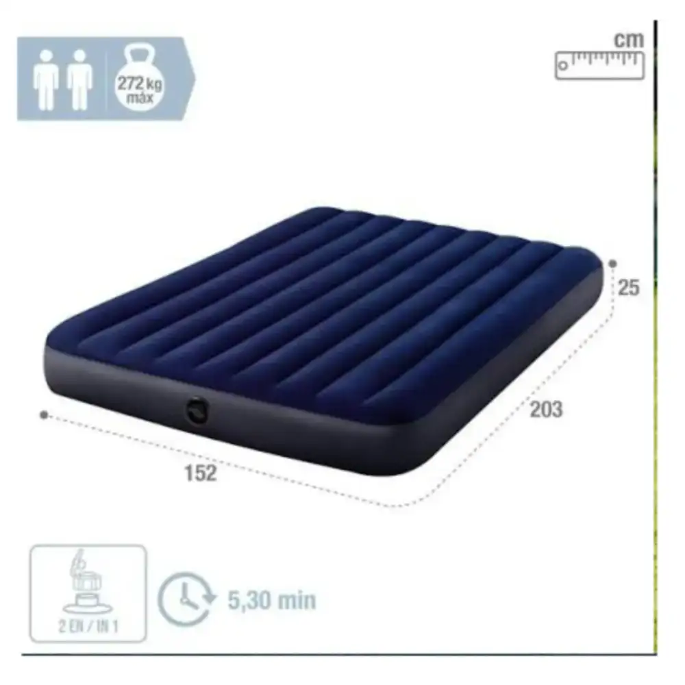 • Ideal para familias que buscan una solución versátil, este colchón inflable combina comodidad, durabilidad y estilo con su elegante color azul oscuro, convirtiéndose en el complemento perfecto para cualquier habitación o espacio de descanso. Con su diseño compacto y ligero, se adapta a cualquier espacio, desde la sala de estar hasta la habitación de invitados, ofreciendo una experiencia de sueño superior sin comprometer la estética del hogar.