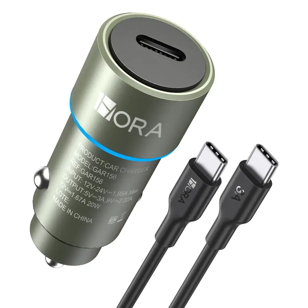 Cargador de coche de alta velocidad GAR156 de 20W con puerto USB‑C a USB‑A, carga simultánea de dispositivos en 1 hora, diseño compacto y elegante en color negro, compatible con smartphones, tablets y laptops, ideal para viajes y uso diario