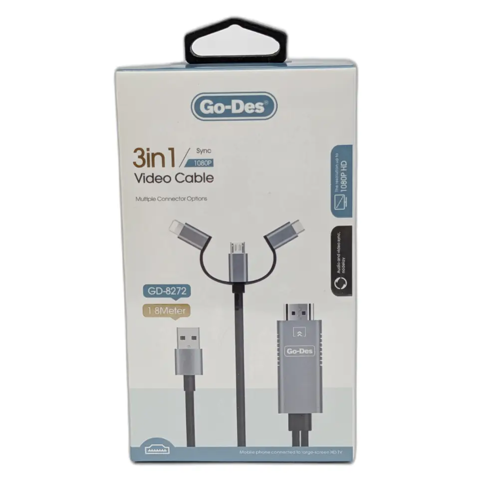 • El Cable de Video Go-Des 3en1 GD-8272 ofrece una conectividad inigualable, permitiendo la transmisión de video y audio de alta calidad desde múltiples dispositivos a tus pantallas favoritas. Su diseño todo-en-uno elimina la necesidad de cables adicionales, facilitando la organización y la experiencia de usuario.