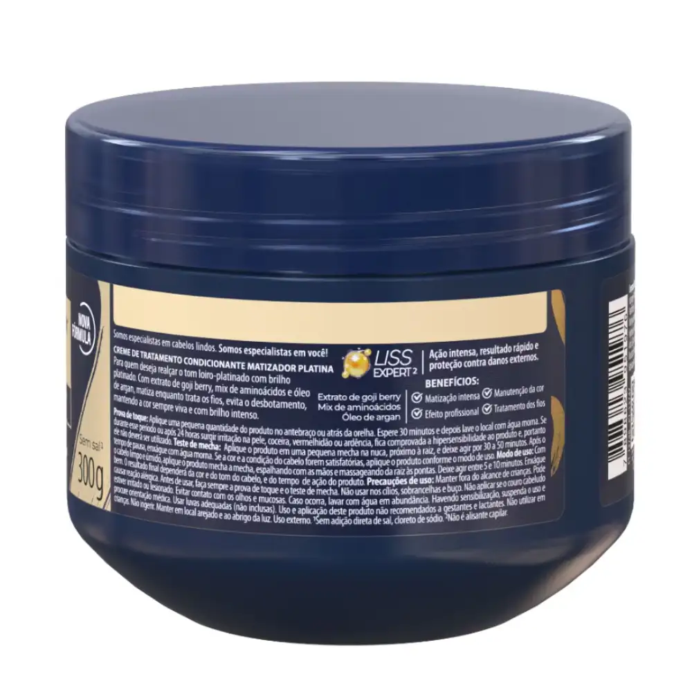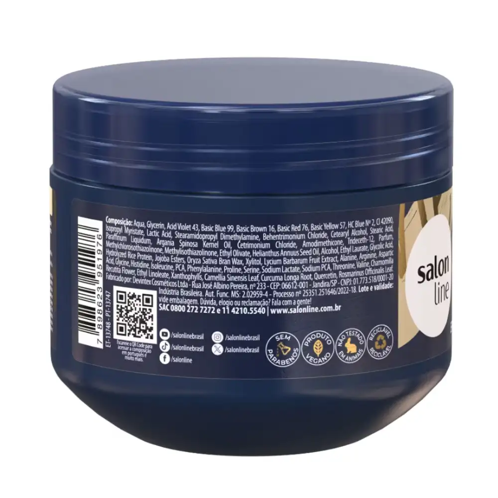 Máscara Capilar Matizadora Salon Line Meu Liso Platina 300 g: neutraliza tonos amarillos, nutre con argán y jojoba, brinda brillo en cabello liso y radiante.