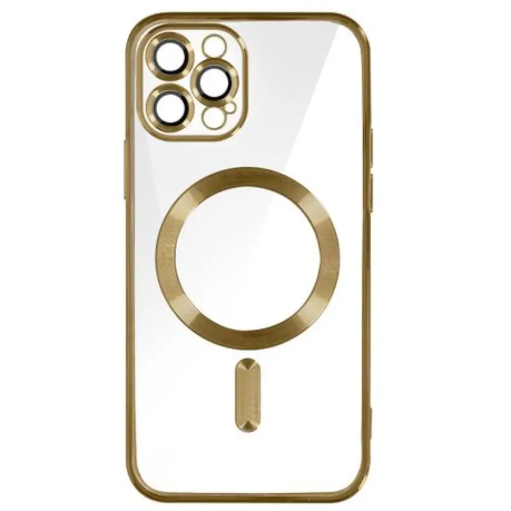 Cover transparente compatible con iPhone 15 Pro Max, protección resistente a golpes y rayones, carga inalámbrica rápida y diseño ultrafino con bordes dorados.