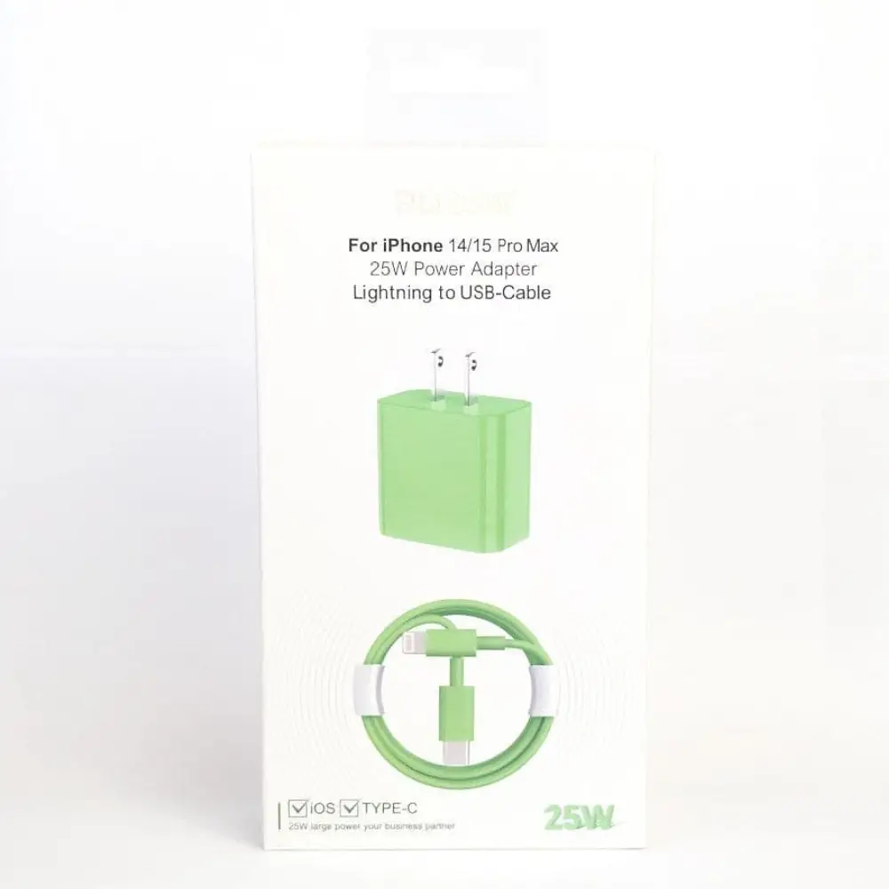Cargador rápido de 25W para iPhone 14/15 Pro Max con conector Lightning, ideal para carga eficiente y segura en cualquier lugar.