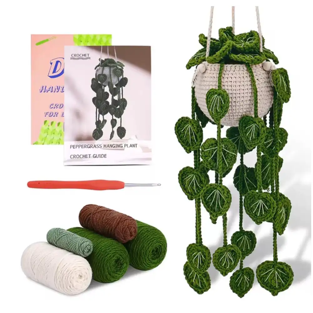 Descubre el kit de crochet completo para crear una planta colgante en maceta, con hilo premium, guía paso a paso y maceta decorativa, ideal para decorar tu hogar.