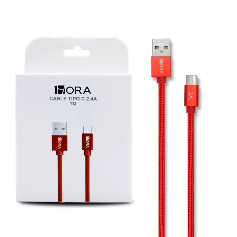 Cable de carga rápido Tipo C de 1 metro, trenzado en rojo, modelo CAB249, con corriente de 2.4A, compatible con dispositivos USB‑C, ideal para smartphones, tablets y laptops, garantiza transferencia de datos y carga segura, y protección contra sobrecalentamiento