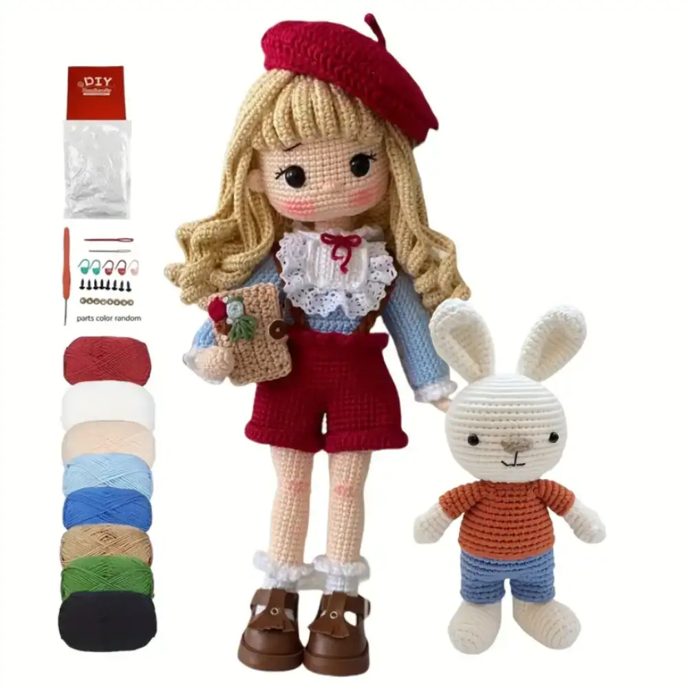 Kit de crochet Amigurumi con muñeca princesa y conejo, incluye hilos premium, patrones paso a paso y accesorios decorativos ideal para crear figuras únicas y regalar.