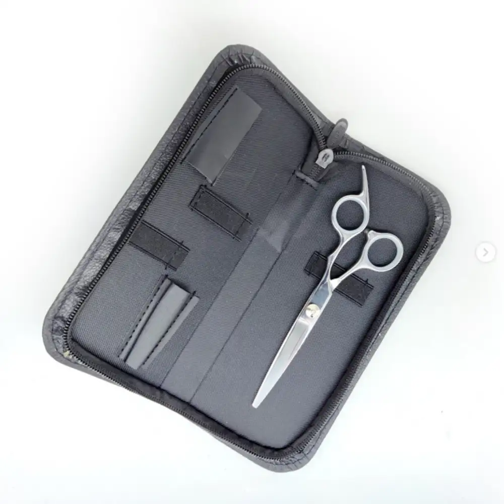 Tijera de acero inoxidable profesional con estuche protector, mango ergonómico y hoja afilada, perfecta para salones de belleza y barberías que buscan cortes precisos y duraderos.