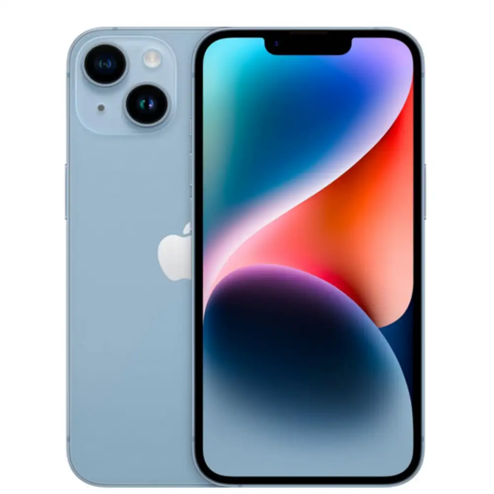 iPhone 14 renovado de 128 GB en azul, pantalla Super Retina XDR, cámara dual, A15 Bionic, iOS 17, 5G y batería optimizada calidad certificada y rendimiento como nuevo.