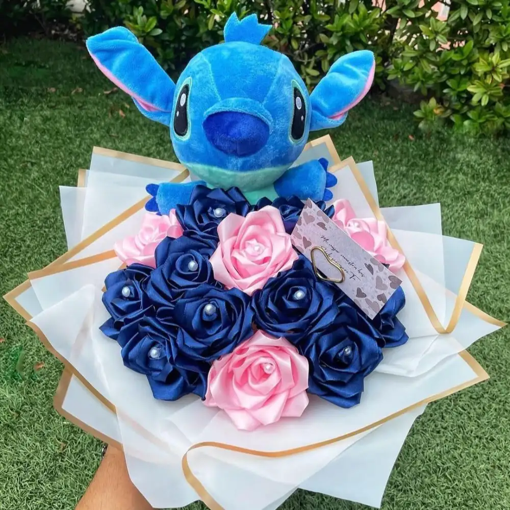 Arreglo artesanal de flores de tela con peluche de Stitch, detalle compacto y elegante para mesas de bodas, cumpleaños y eventos, aportando encanto único.