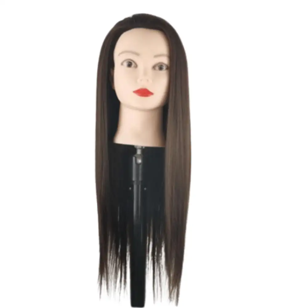 Maniquí de práctica con cabello sintético de 70 cm en castaño oscuro, perfecto para entrenar cortes, peinados y coloración en salones de belleza en Panamá.