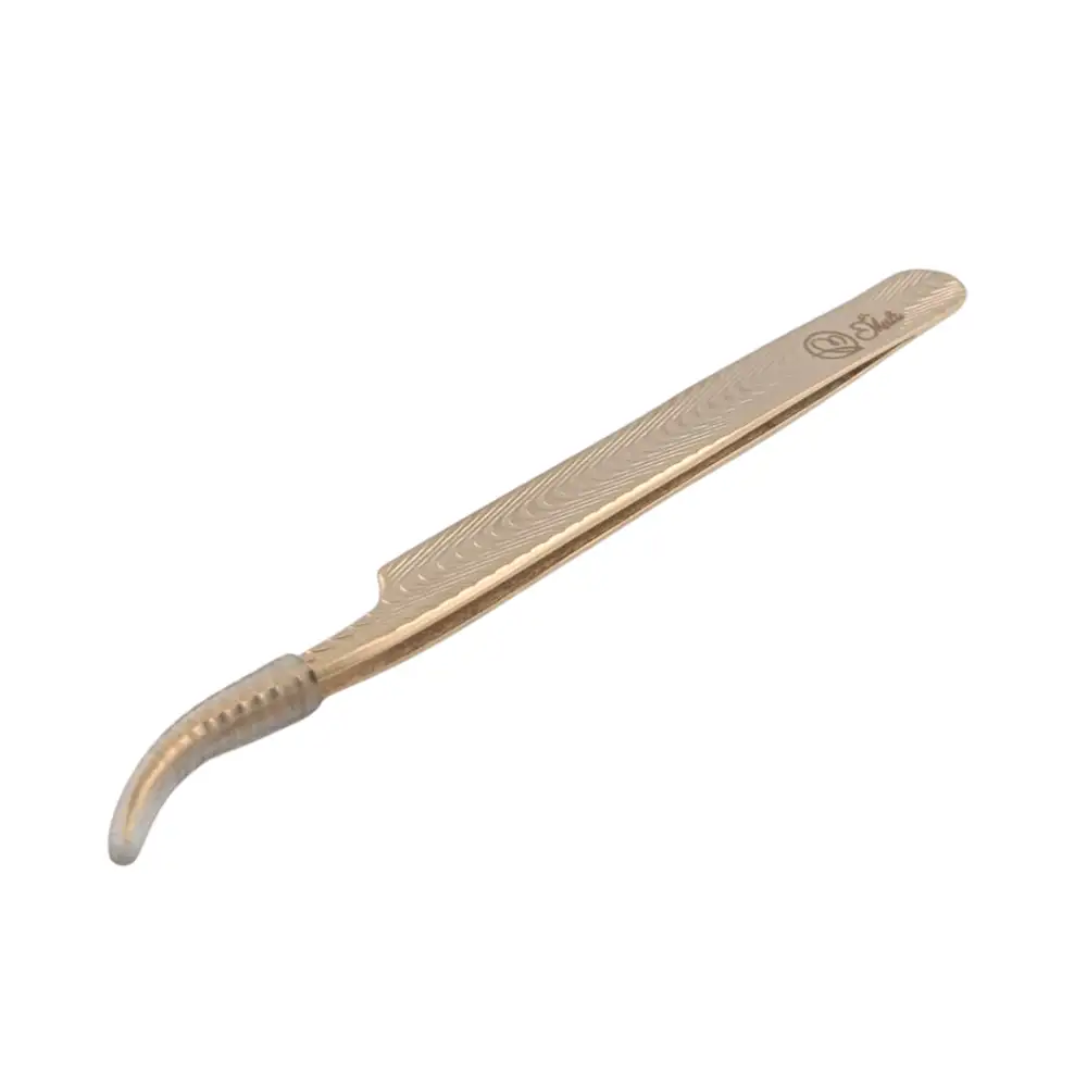 Pinzas de precisión con acabado oro champán y mango ergonómico, ideales para estilistas de extensiones de pestañas en Panamá, logrando resultados impecables.
