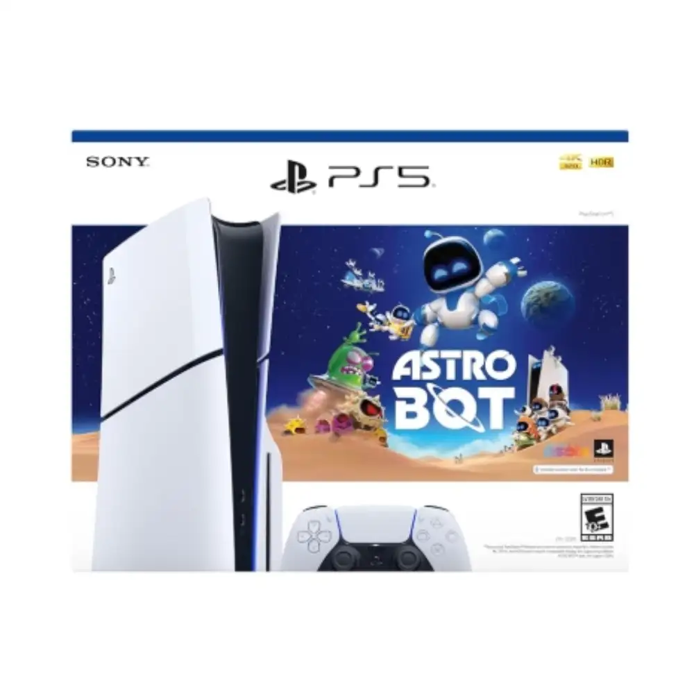 Consola PlayStation 5 versión disco con Astro Bot, incluye juego, DualSense y cámara HD rendimiento 4K, SSD ultra rápido y experiencia inmersiva.