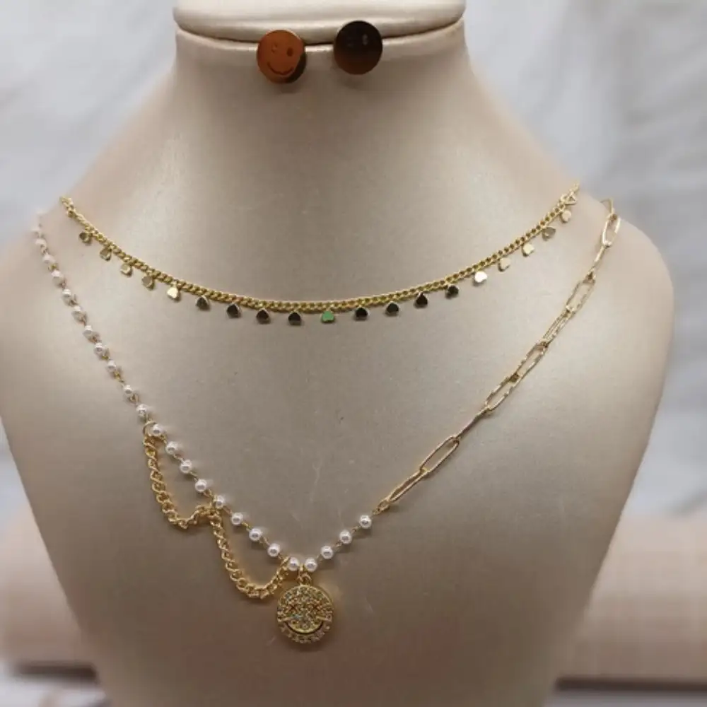Descubre el set de cadena y aretes dorados con perlitas delicadas, ideal para realzar atuendo combina elegancia y calidad en una presentación premium.