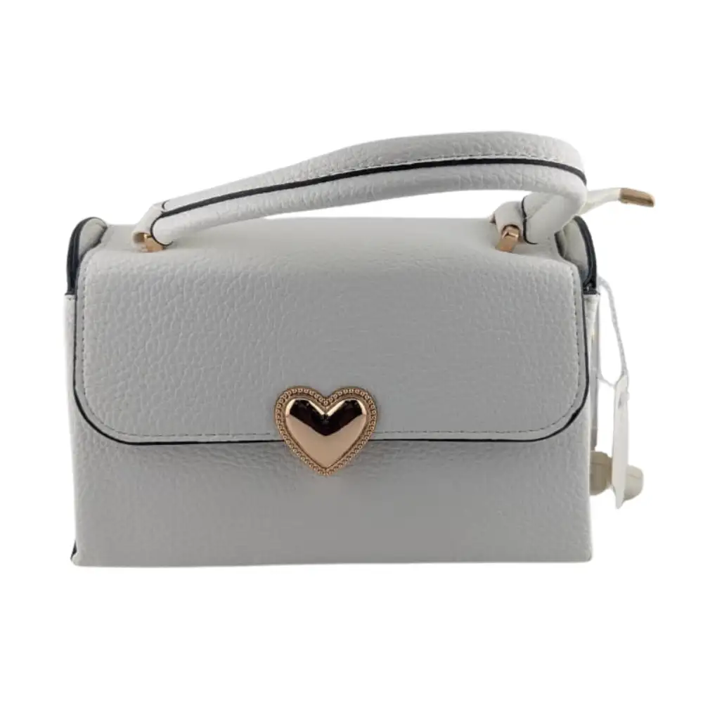 Cartera pequeña de mano en blanco con asa superior, broche corazón y accesorio cruzado combina elegancia y funcionalidad para llevar lo esencial con estilo en cualquier ocasión.