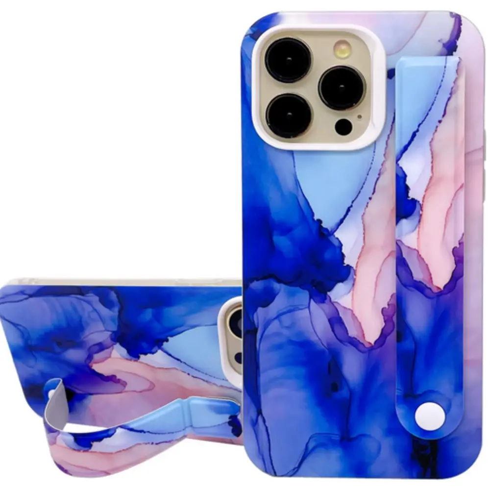Funda para iPhone 14 Plus con correa de mano, soporte integrado y protección de TPU. Ideal para uso diario y fácil manejo.