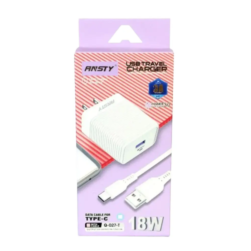 Cargador Ansty Q-027-T de 18W y 3A para carga rápida de dispositivos USB tipo C. Diseño compacto y protección avanzada para tus dispositivos.
