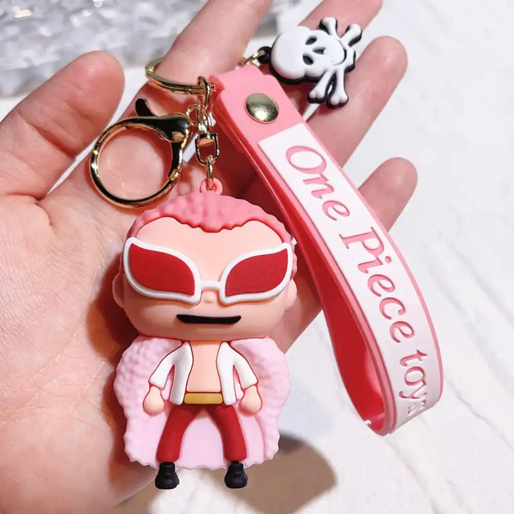 Descubre el llavero de goma oficial de One Piece con Donquixote Doflamingo, un accesorio resistente y detallado, ideal para coleccionistas y fans del anime.