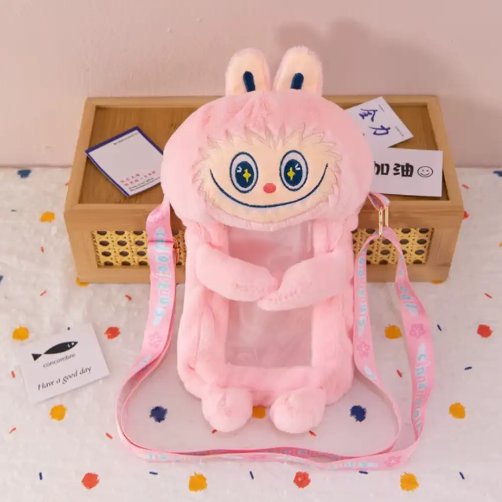 Mochila Labubu rosa con diseño de peluche, resistente y cómoda para niños, perfecta para guardar útiles escolares y juguetes con estilo y durabilidad.