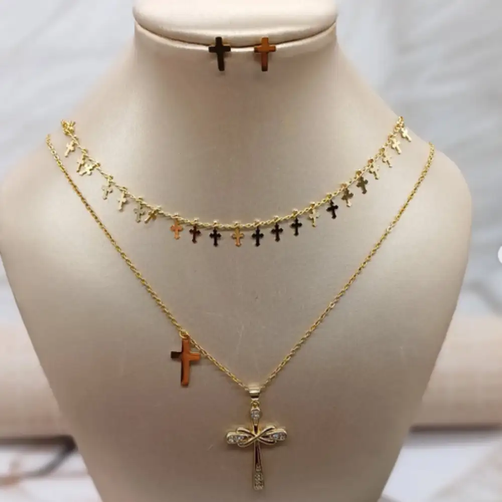 Set de cadena y aretes dorados con dijes de cruces, joyería elegante y versátil, ideal para realzar cualquier look, con acabado brillante y presentación premium para regalo especial.