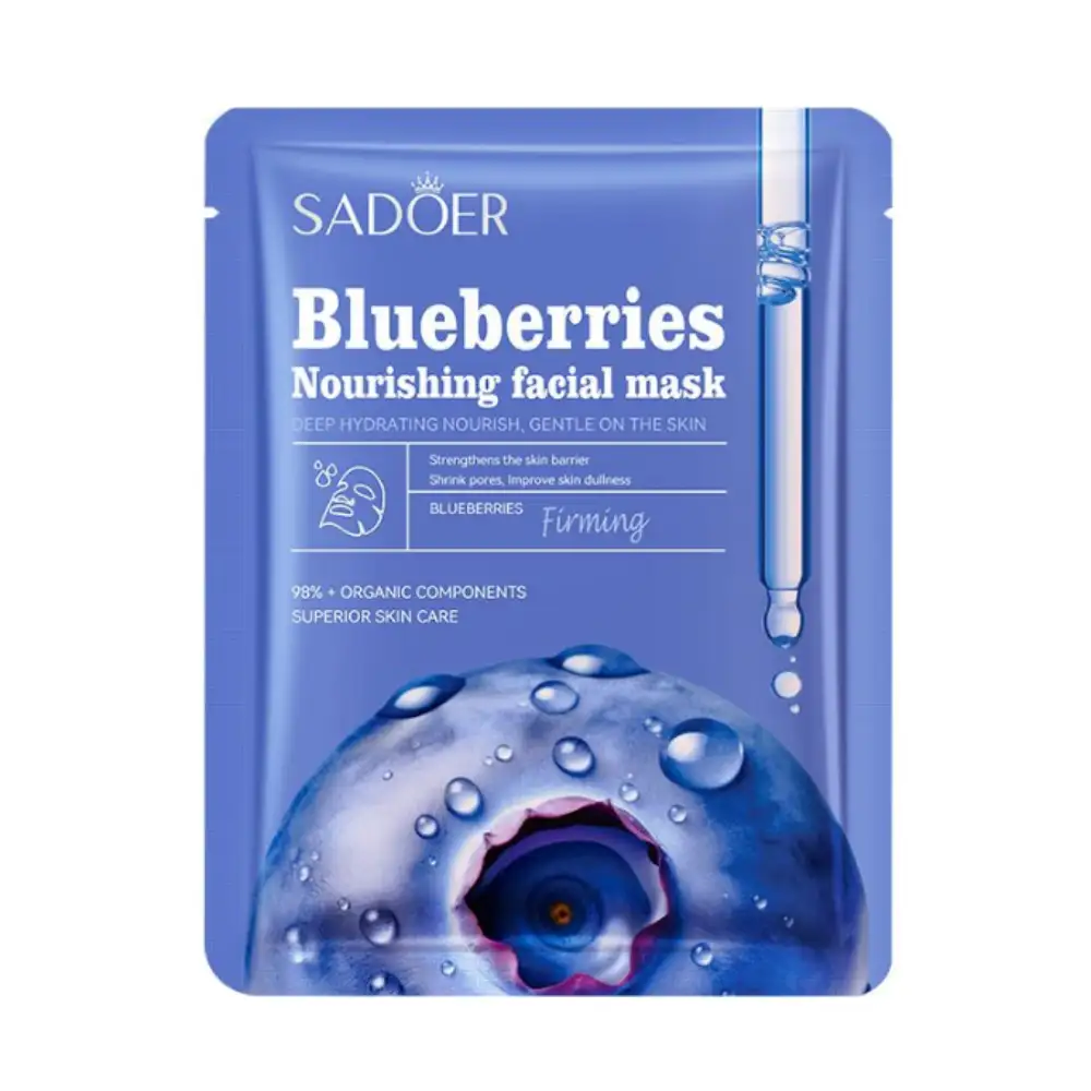 Mascarilla facial de blueberries SADOER con antioxidantes, vitamina C y ácido hialurónico hidrata, ilumina y rejuvenece la piel para un rostro radiante.