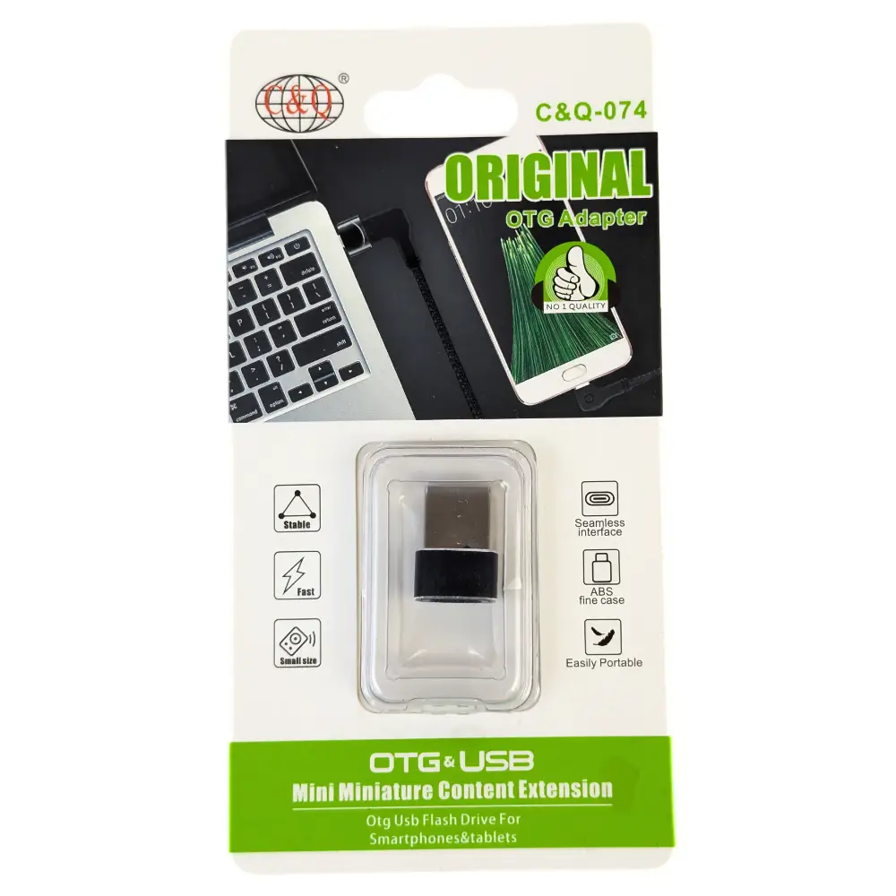 Adaptador OTG USB Modelo C&Q-074 negro, ideal para conectar periféricos a tu dispositivo móvil y facilitar la transferencia de archivos.